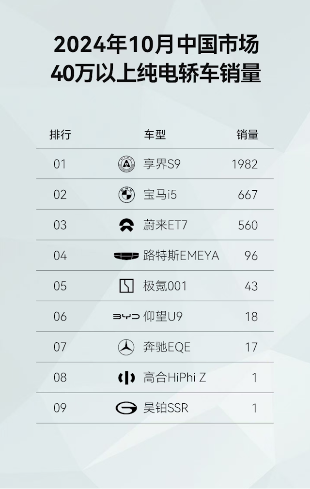 事实上,享界S9的销量,并未受袁启聪测试结果的影响。10月份,享界S9单月卖出1982台,成为了40万以上纯电轿车这一细分市场的销冠。